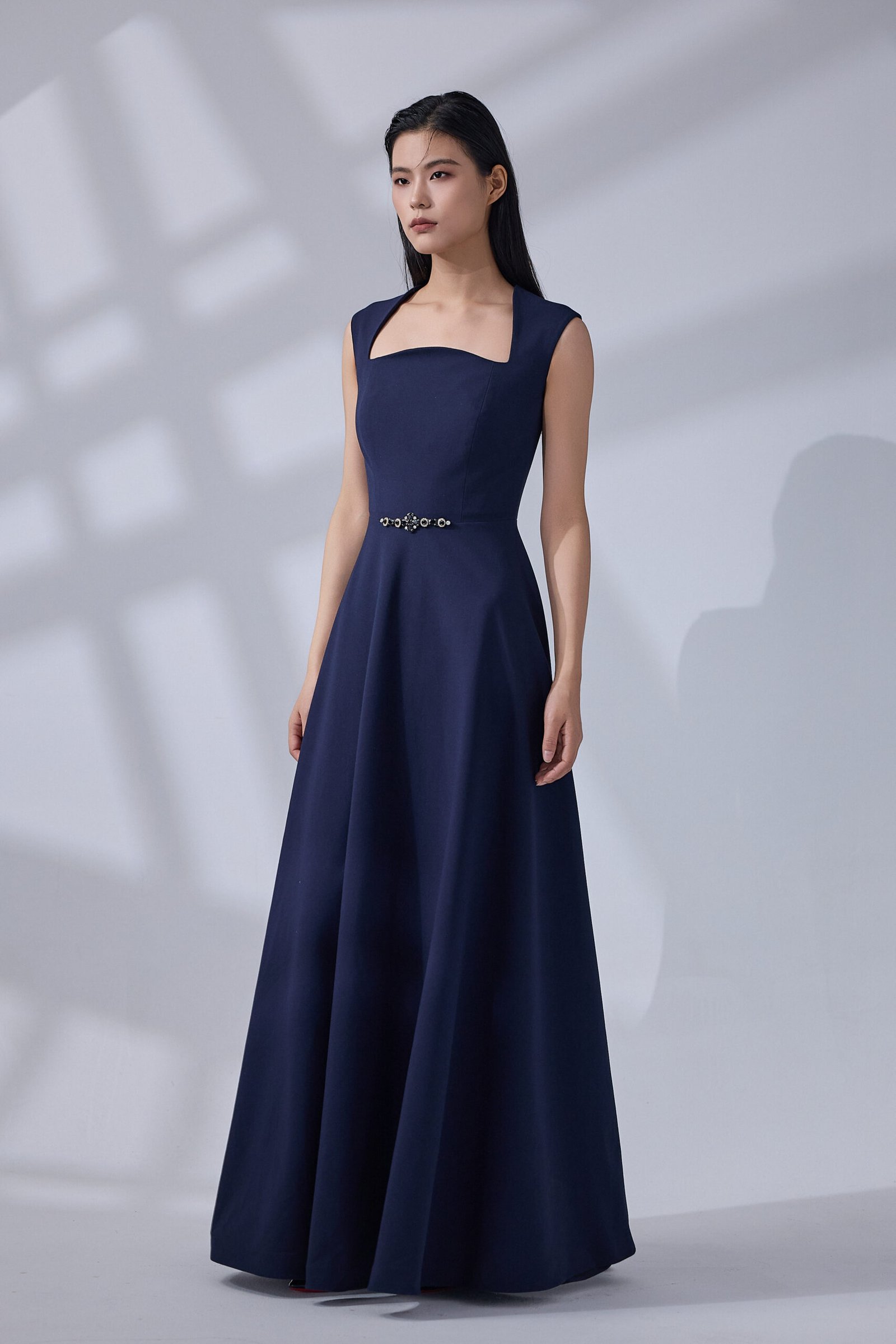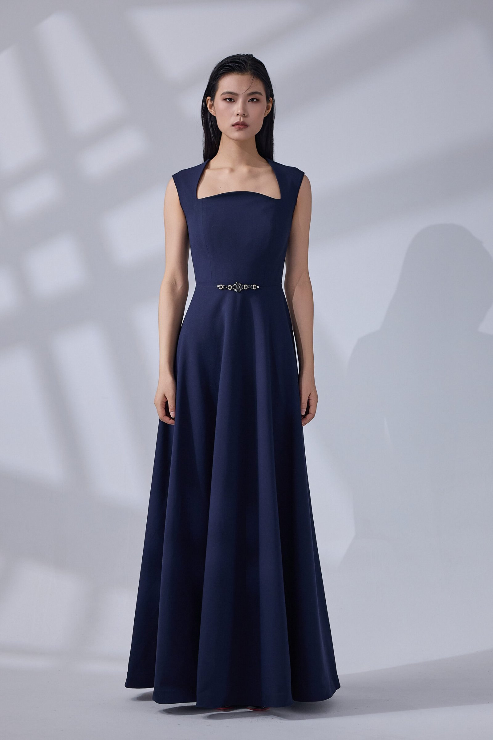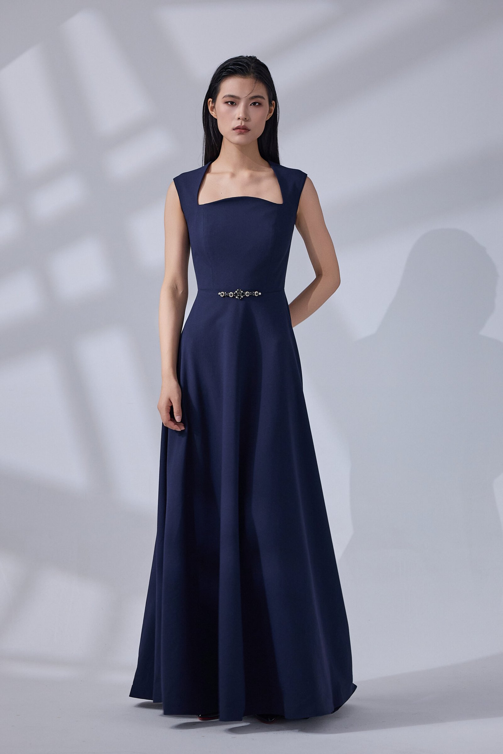 dress featuring a classic A-line silhouette and a modern square neckline. The waist is accented with shimmering crystal embellishments for a touch of luxury, making it a perfect choice for formal events and galas.