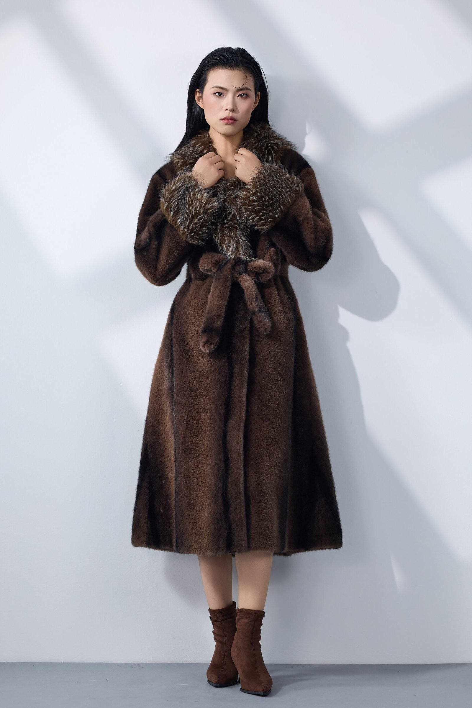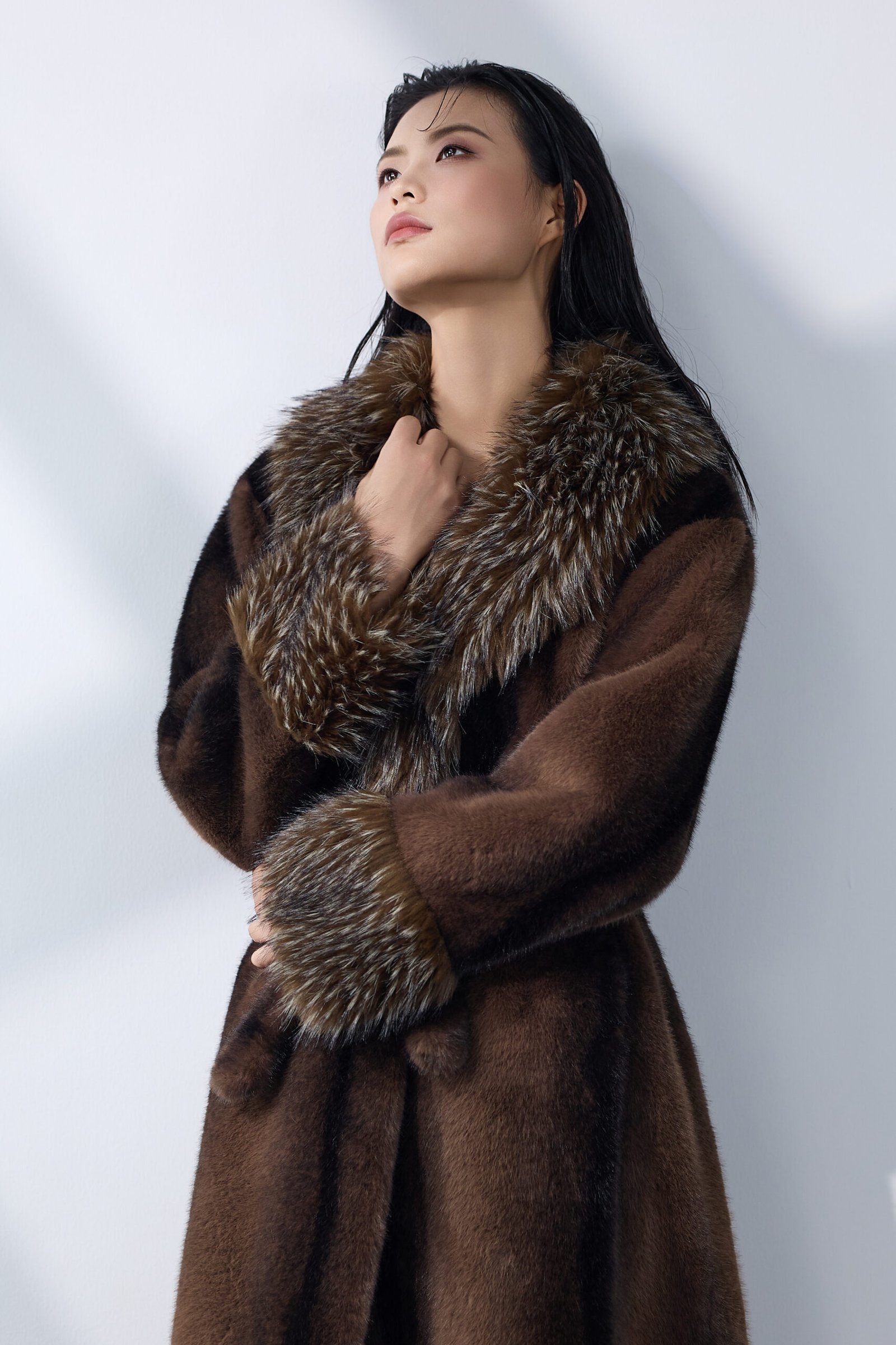 A long faux-fur coat designed with an elevated
